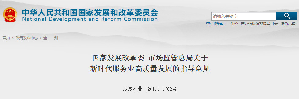 為深入貫徹黨的十九大精神,落實《中共中央、國務(wù)院關(guān)于推動高質(zhì)量發(fā)展的意見》要求,促進我國服務(wù)業(yè)高質(zhì)量發(fā)展,國家發(fā)展改革委、市場監(jiān)管總局制定《關(guān)于新時代服務(wù)業(yè)高質(zhì)量發(fā)展的指導意見》。指導意見突出宏觀統(tǒng)籌,圍繞制約服務(wù)業(yè)高質(zhì)量發(fā)展的薄弱環(huán)節(jié)和共性問題部署任務(wù),分行業(yè)高質(zhì)量發(fā)展由行業(yè)主管部門部署實施。
