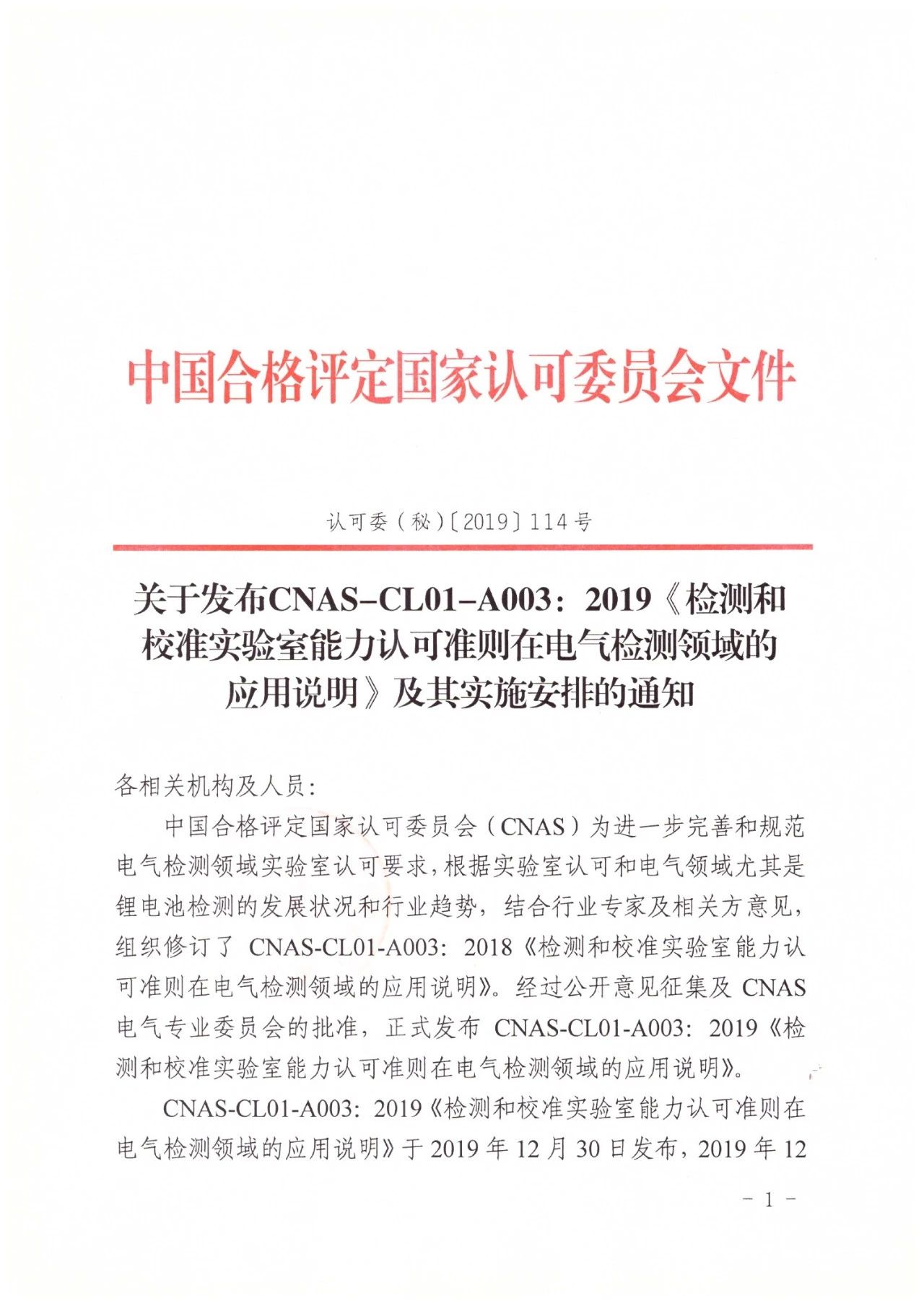 關于發布CNAS-CL01-A003:2019《檢測和校準實驗室能力認可準則在電氣檢測領域的應用說明》及其實施安排的通知