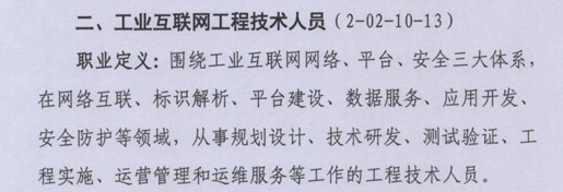工業互聯網是新出來的業態,工業互聯網工程技術人員的職業定義是:圍繞工業互聯網網絡、平臺、安全三大體系,在網絡互聯、標識解析、平臺建設、數據服務、應用開發、安全防護等領域,從事規劃設計、技術開發、測試驗證、工程實施、運營管理和運維服務等工作的工程技術人員。