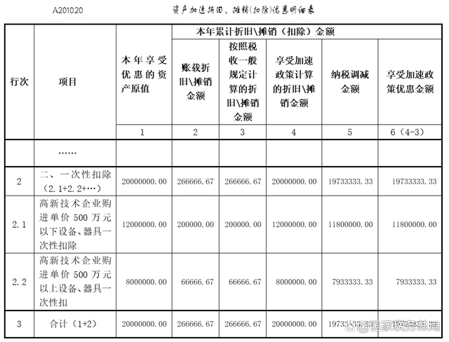 第一步,先填報一次性扣除情況。對于單價500萬元以下設備、器具,在《資產加速折舊、攤銷(扣除)優惠明細表》(A201020)第2行“二、一次性扣除”下的明細行次中填寫“高新技術企業購進單價500萬元以下設備、器具一次性扣除”事項及“本年享受優惠的資產原值”等信息;對于單價500萬元以上設備、器具,填寫“高新技術企業購進單價500萬元以上設備、器具一次性扣除”事項及“本年享受優惠的資產原值”等信息。填寫完畢后,將該表單中“納稅調減金額”列次的合計值(第3行第5列)填寫在《中華人民共和國企業所得稅月(季)度預繳納稅申報表(A類)》(A202000)第6行“資產加速折舊、攤銷(扣除)調減額(填寫A201020)”中。