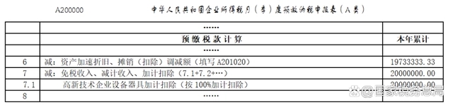 第二步:在《中華人民共和國企業所得稅月(季)度預繳納稅申報表(A類)》(A200000)第7行“減:免稅收入、減計收入、加計扣除”下的明細行次填報加計扣除情況。手工申報的,在明細行次填寫“高新技術企業設備、器具加計扣除(按100%加計扣除)”事項及加計扣除金額。通過電子稅務局申報的,申報系統自動填報相關事項及加計扣除金額。